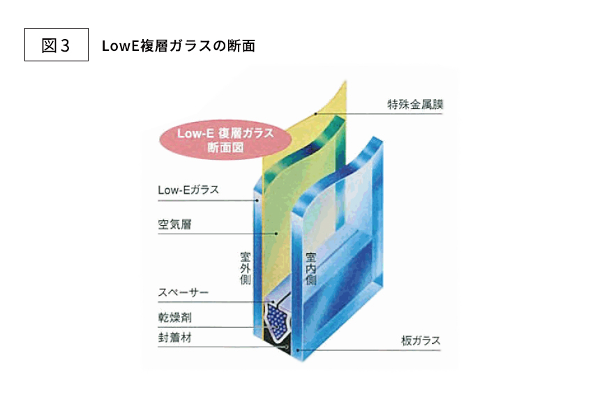 樹脂サッシの、ガラス部に関しては、通常のアルミサッシでも一般に採用されてきているLowE複層ガラスを採用していますが、複層ガラスに挟まれた断熱層として機能する空気層の厚みは、一般的な6mmではなく倍の12mmと断熱機能を強化しています。更に外側ガラスの内側に特殊金属コーテイングを施し、外から必要な輻射熱のみ取り入れつつ、室内から外への輻射熱を逃がさない仕様を採用しています。