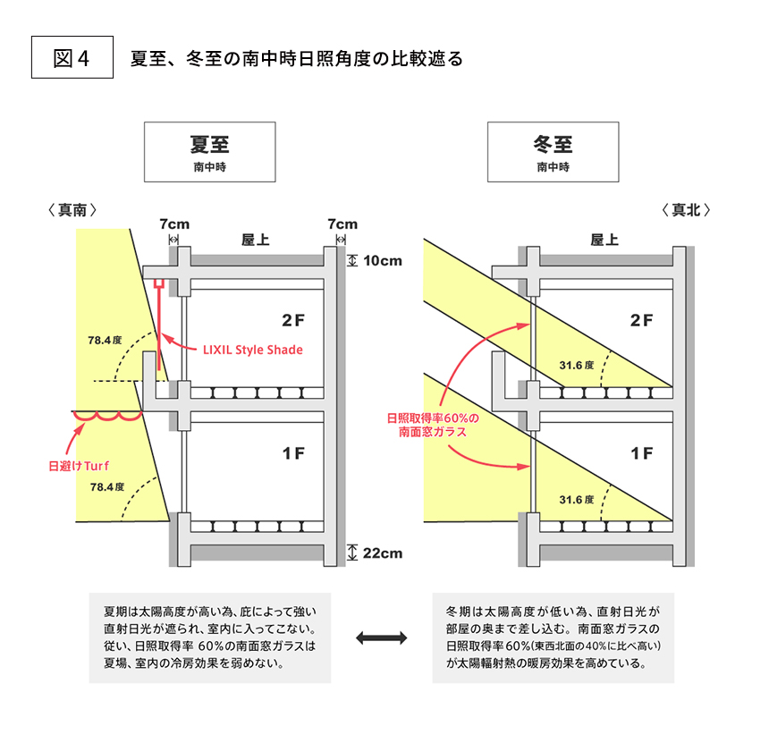 太陽南中時高度の夏至における78.4度と冬至における31.6度の差を利用し、図4にあるように、夏は庇で強烈な日差しを避け、逆に冬は外部からの日射熱を積極的に利用する工夫を当物件ではしています。寒い冬、直射日光のダイレクトゲインを室内暖房に利用するため、LDK南面のガラスだけは日照取得率を60%と、その他の西、北、東の各面のガラスの取得率40%よりは意図的に上げています。
