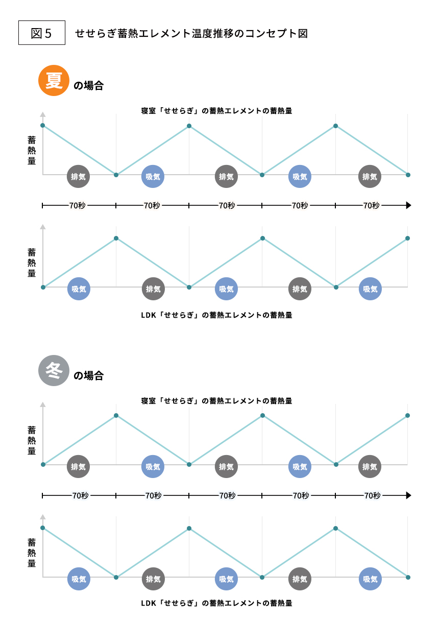 上図、図5をご覧ください。例えば冬、寝室の換気口に注目すると、室内の暖めた空気が換気ファンに押し出されて70秒間排出されます。この時、ファンと外気の間に位置する「蓄熱エレメント」は、空気を排出しつつも、室内暖気の熱を吸熱するため、捨てられる熱は抑制され、他方、「蓄熱エレメント」自身は吸熱により温度が上昇します。排気の70秒間が過ぎると、ファンは逆回転で室外から吸気し始めます。今度は先ほど排気中に一旦温度上昇した「蓄熱エレメント」から、冷たい外気が吸熱し、吸い込まれた冷たい外気を暖めるとともに、「蓄熱エレメント」自身は排熱し、温度は下降し、吸気70秒後には、140秒前に排気し始めた時の蓄熱量とほぼ同じ水準まで戻ってきます。時間の経過と、蓄熱エレメントの熱量(又は温度)の関係をグラフ化すると上図のようになります。吸気排気が2か所の換気口で交互に繰り返されるため、室内に負圧等が生じないようになっています。